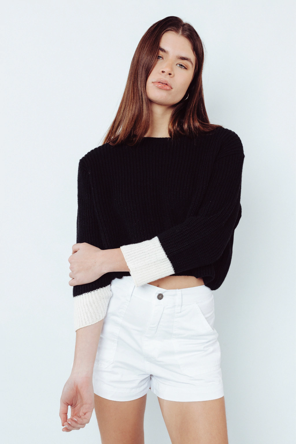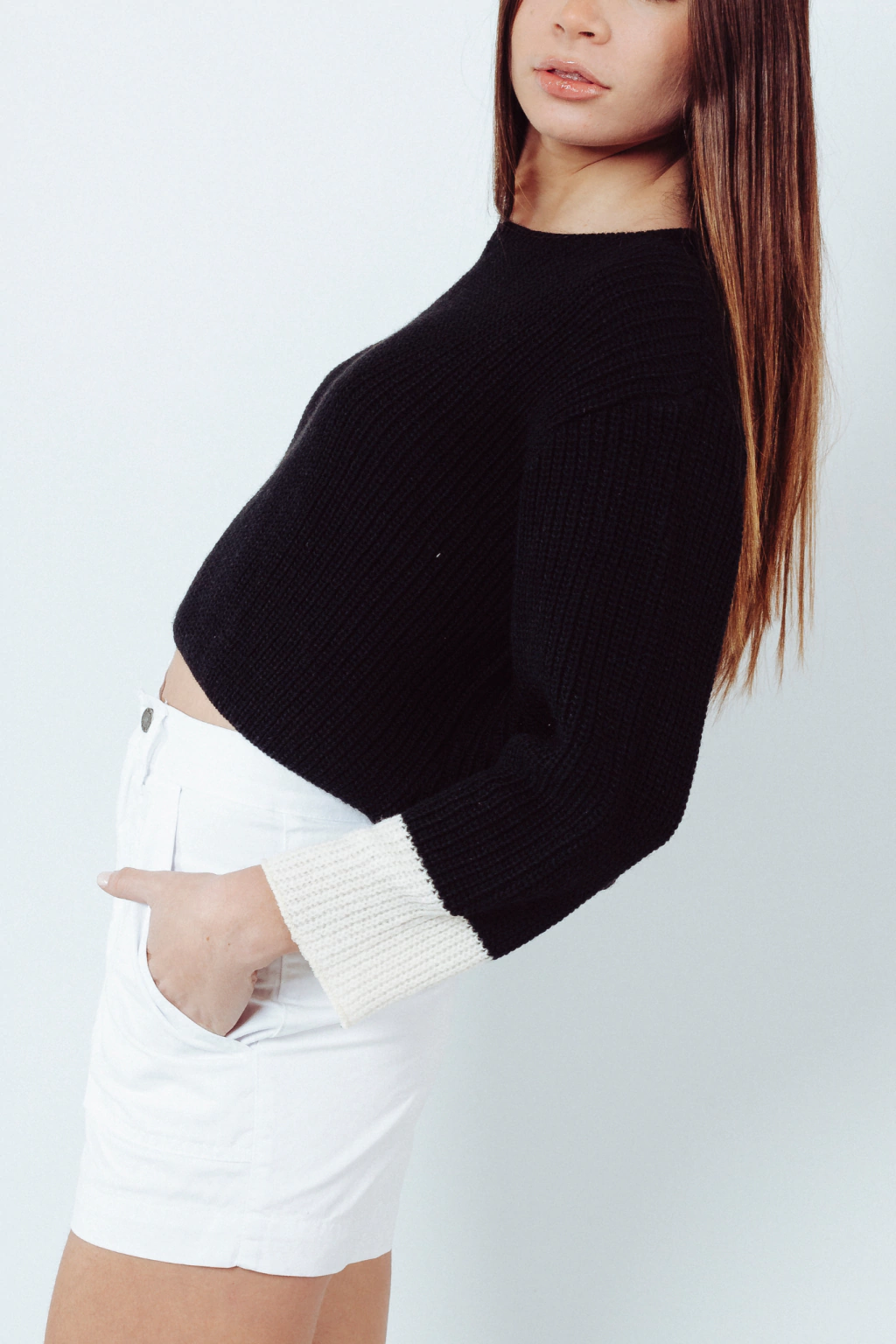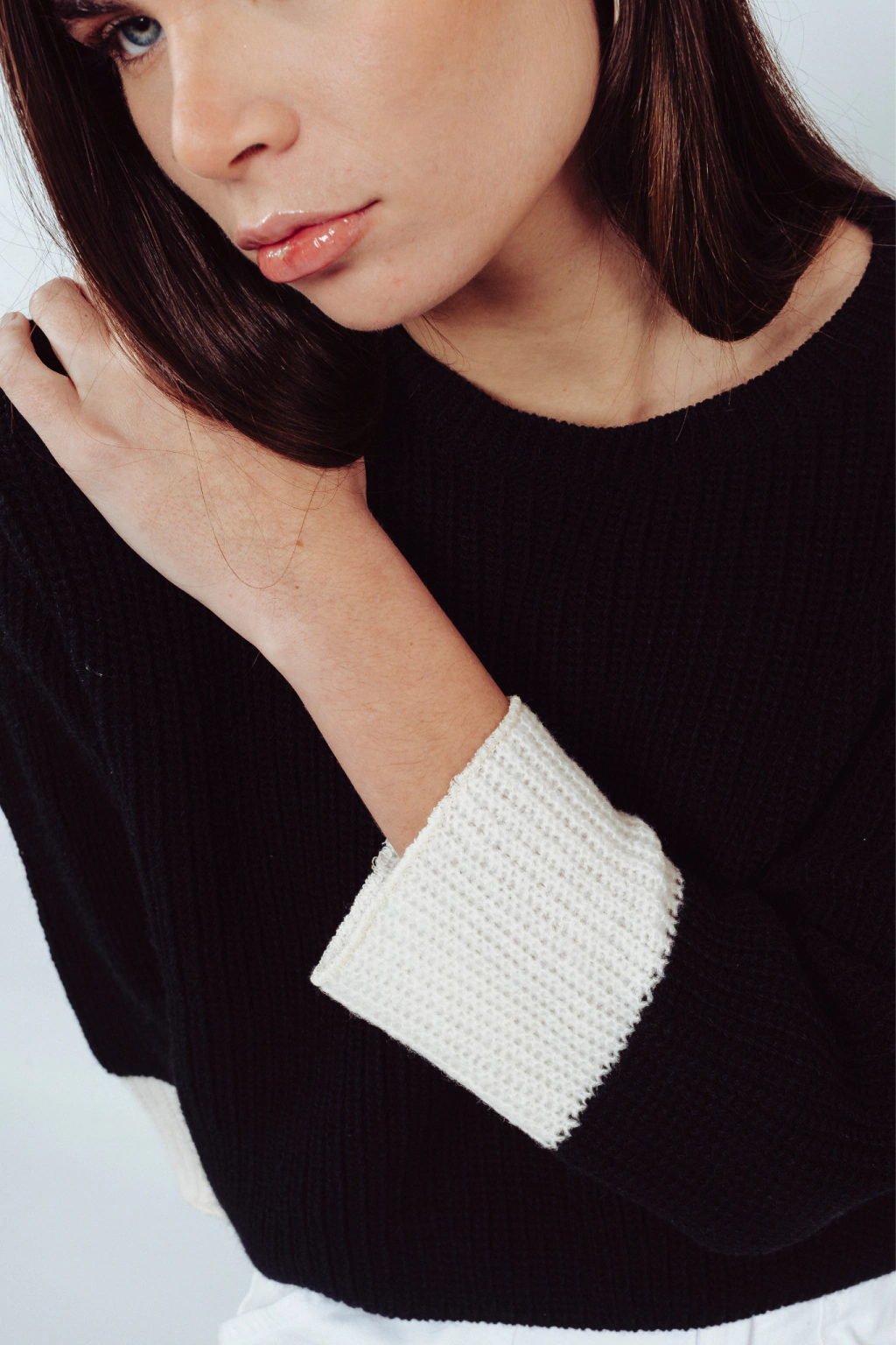 Sweater de lana y algodón de dos tejidos diferentes. La base es lisa negra y sus puños son blancos. El corte es oversized, con escote redondo y mangas 3/4. Talle único.
