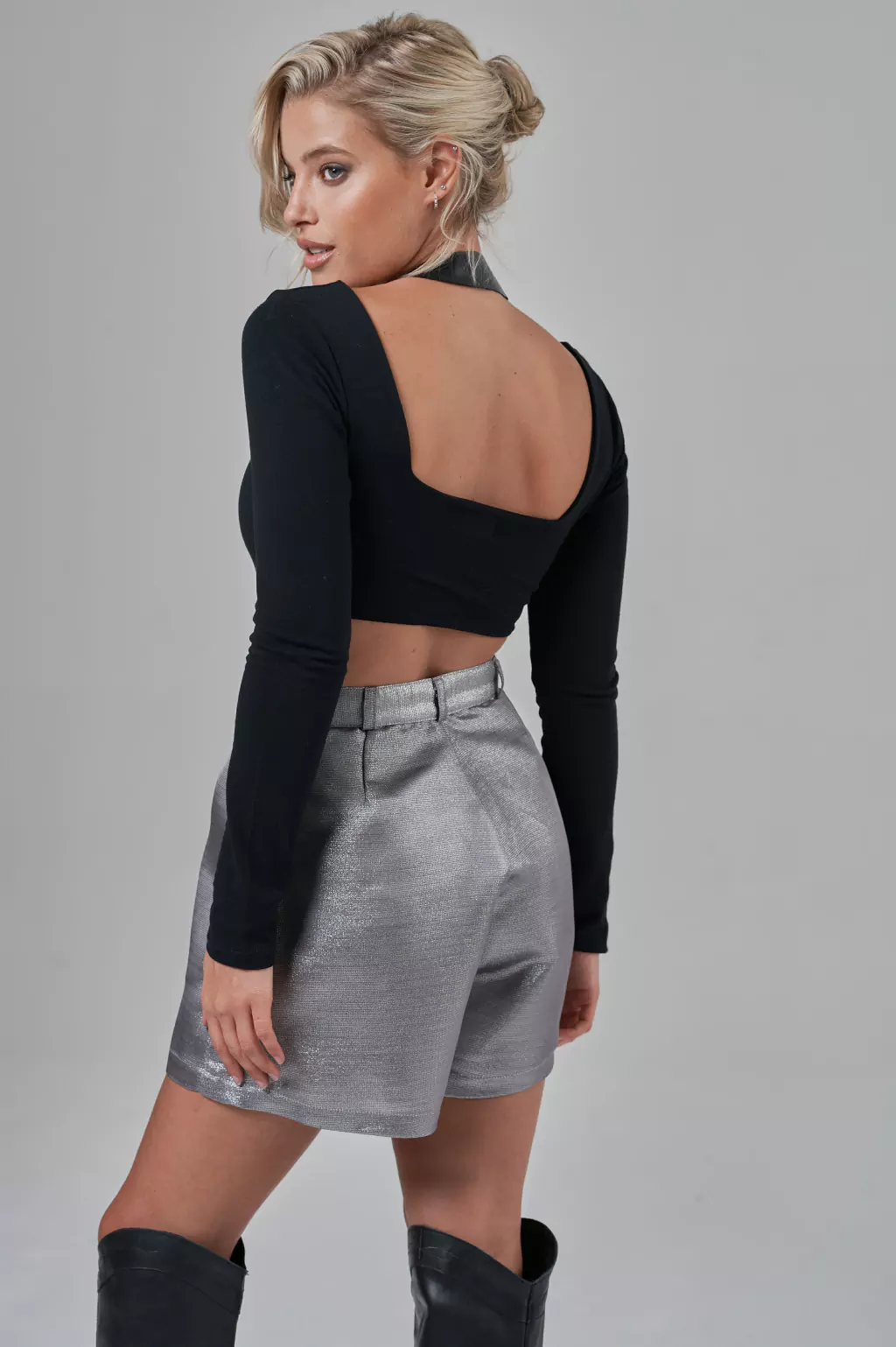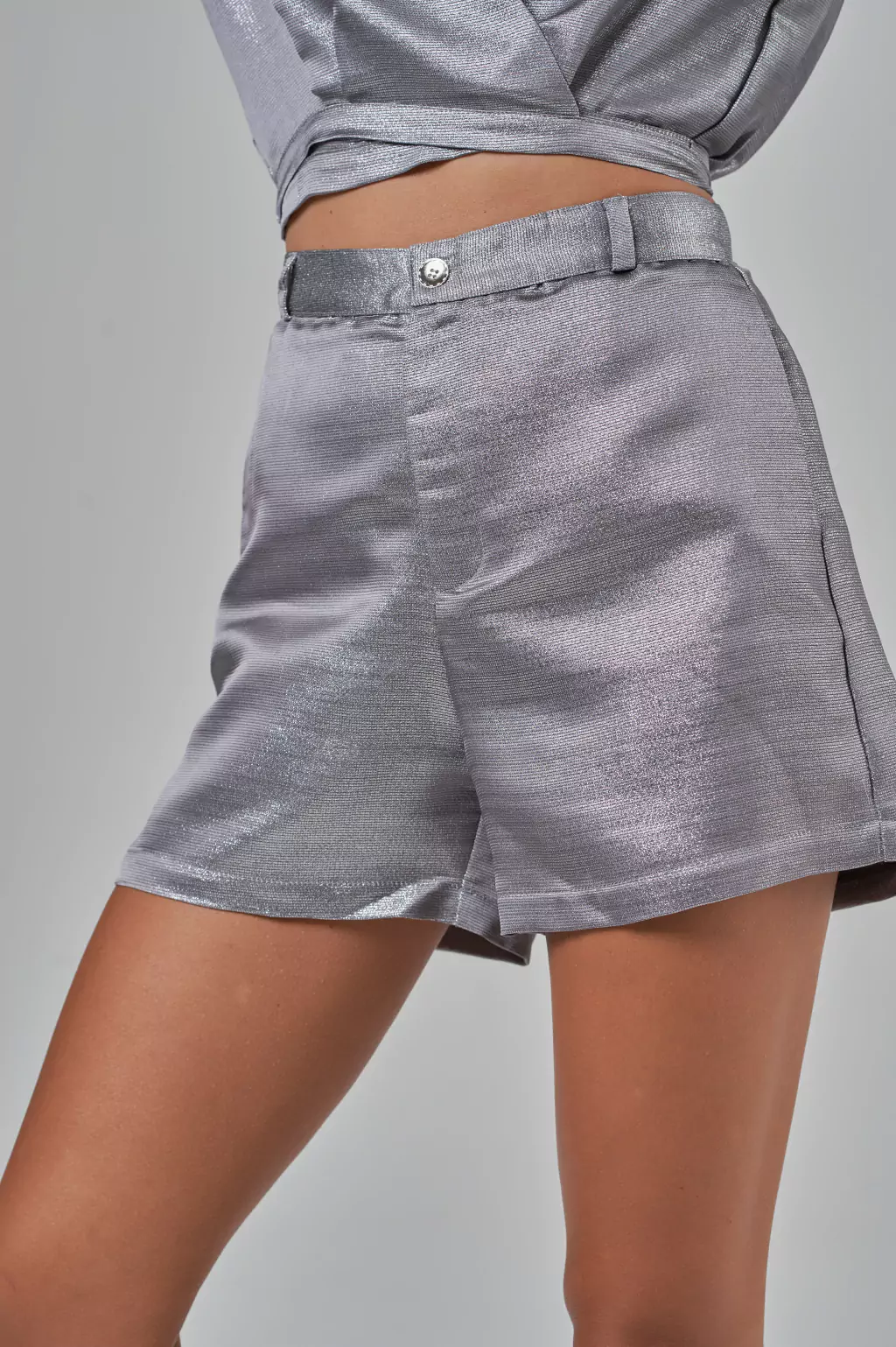 Short tiro alta en tela diferenciada plateada con brillos. Es ajustado a la cintura y suelto en la pierna, lleva dos bosillos en el frente.