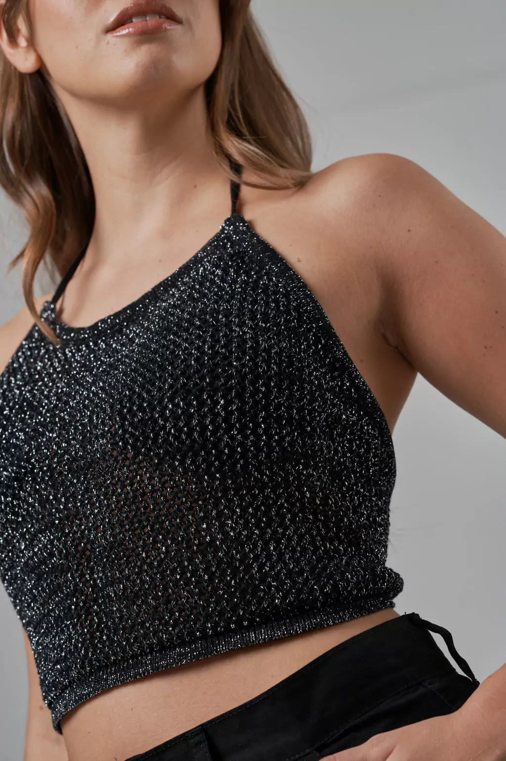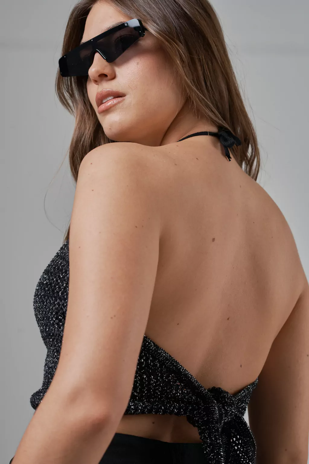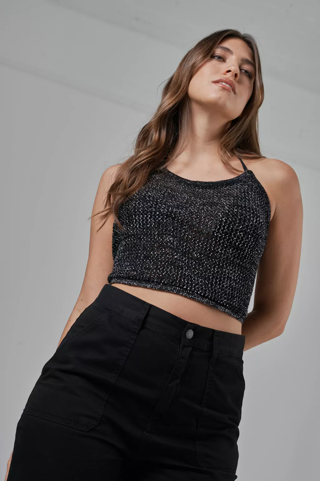 Top tejido, se anuda en la esplada, lleva unas tazas simples en el frente. Composición: 20% fibra metálica 40% viscosa 40% algodón.