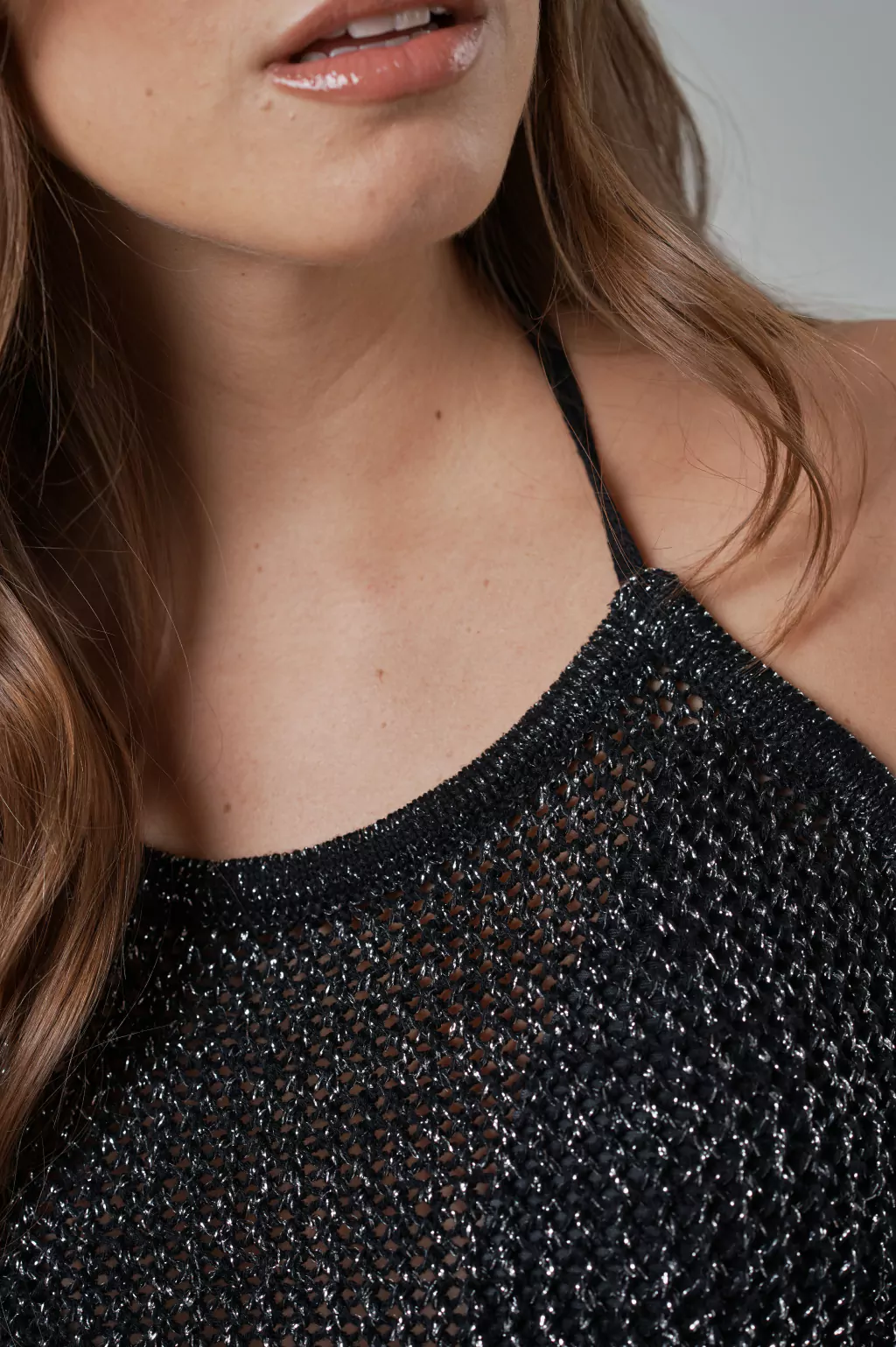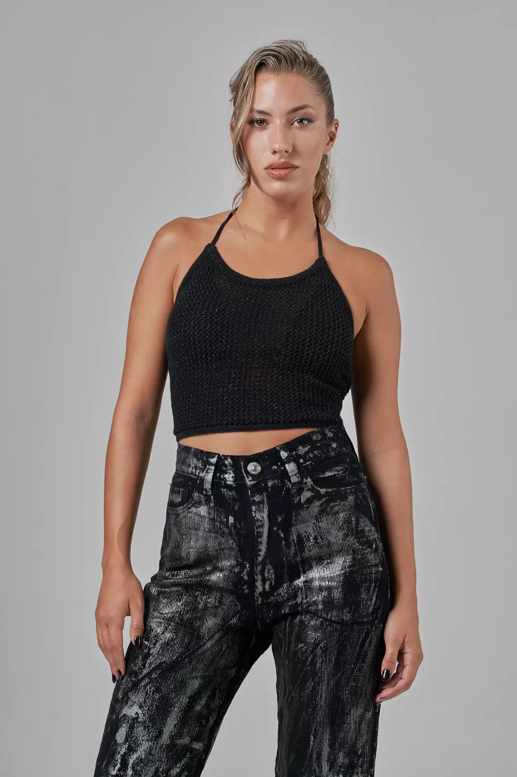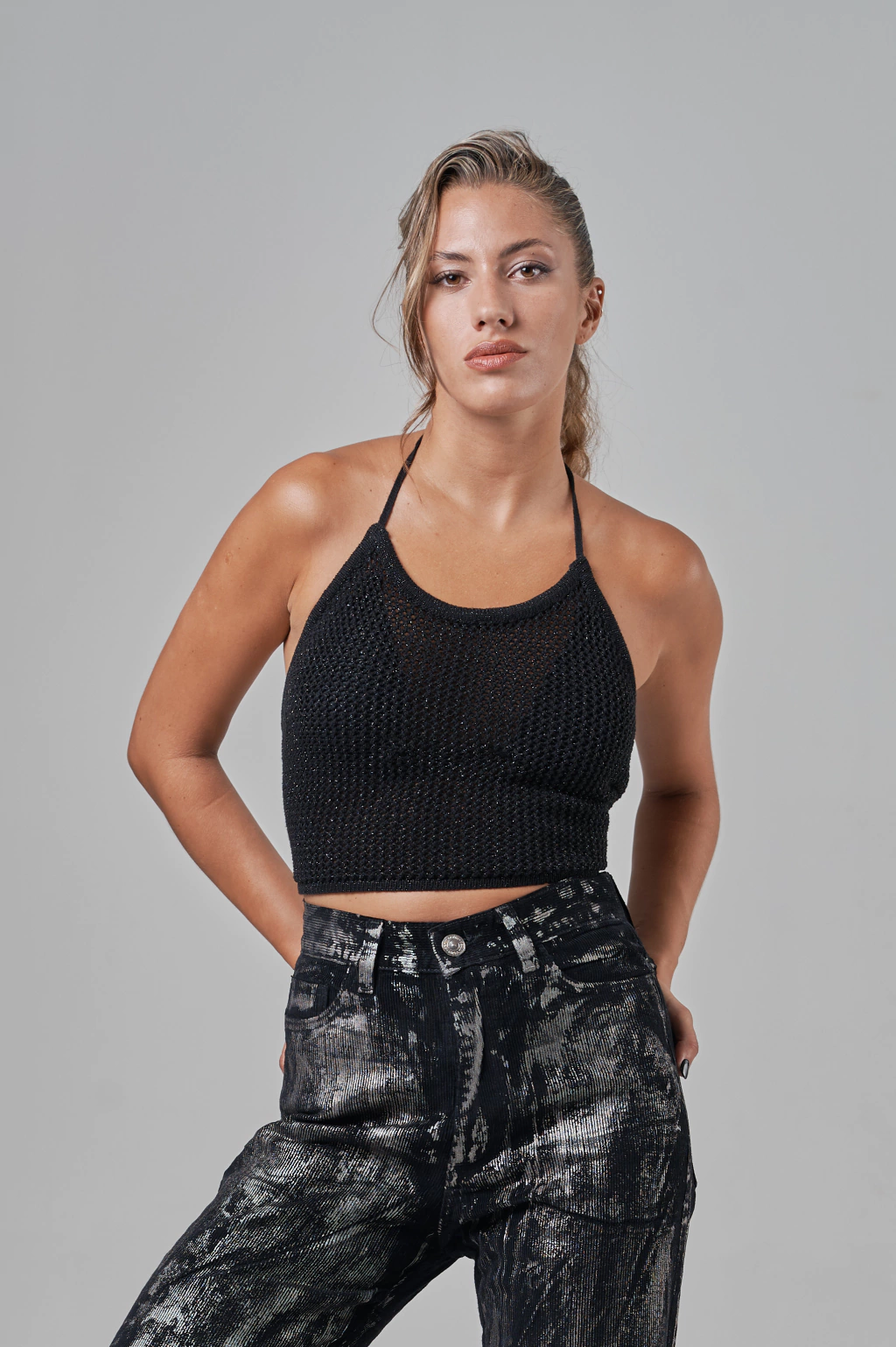Top tejido, se anuda en la esplada, lleva unas tazas simples en el frente. Composición: 20% fibra metálica 40% viscosa 40% algodón.