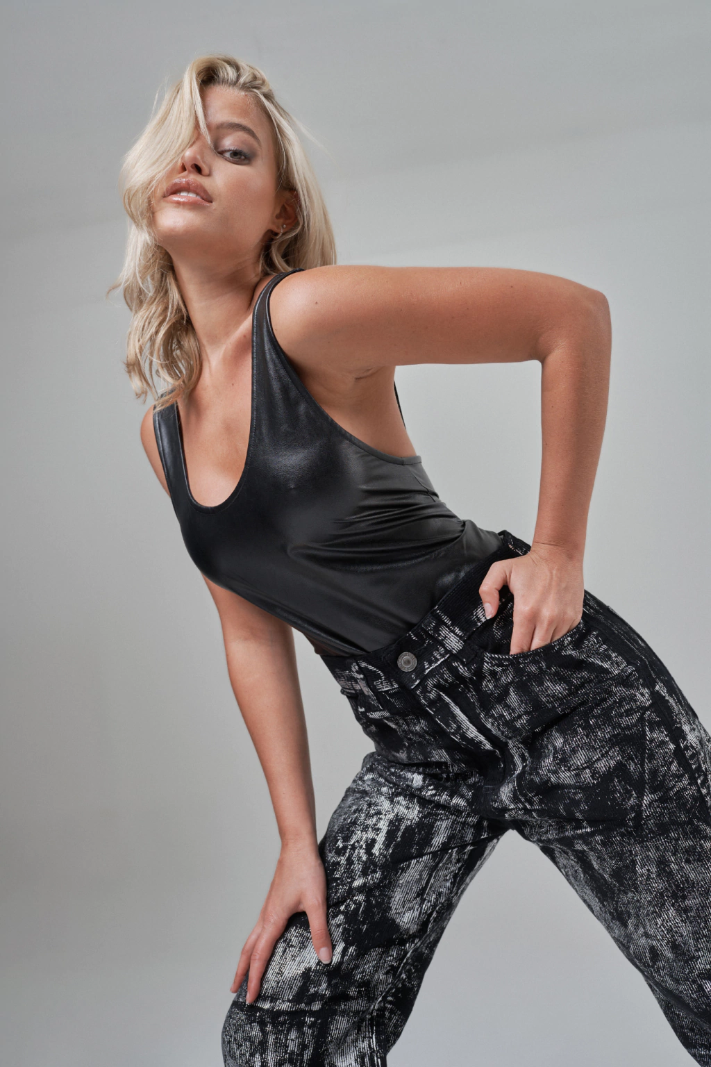 Body en tela simil cuero negro con elasticos anchos al tono en la espalda y escote redondo tipo "U" en el frente.