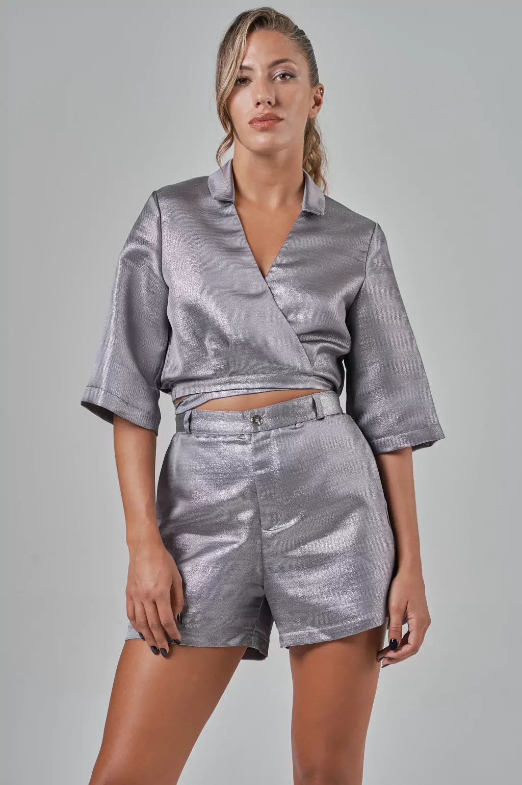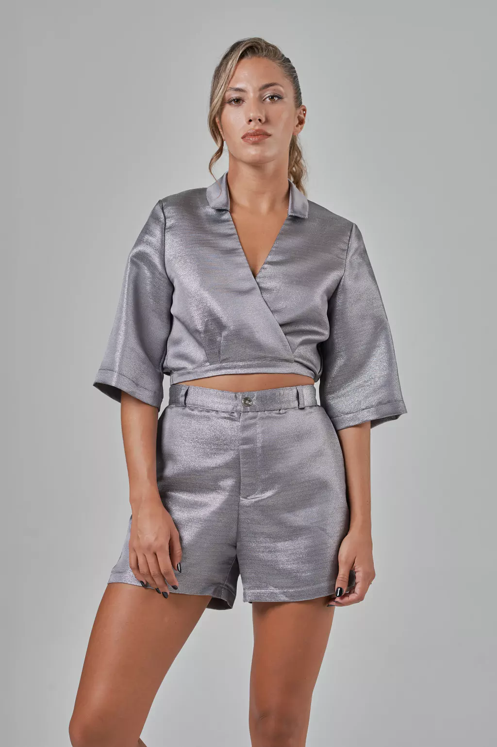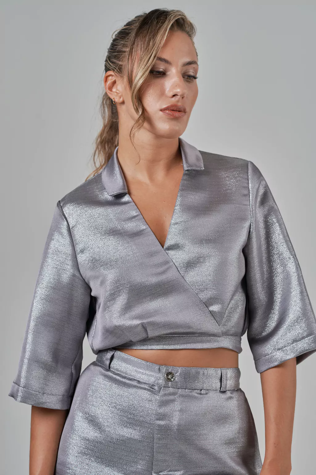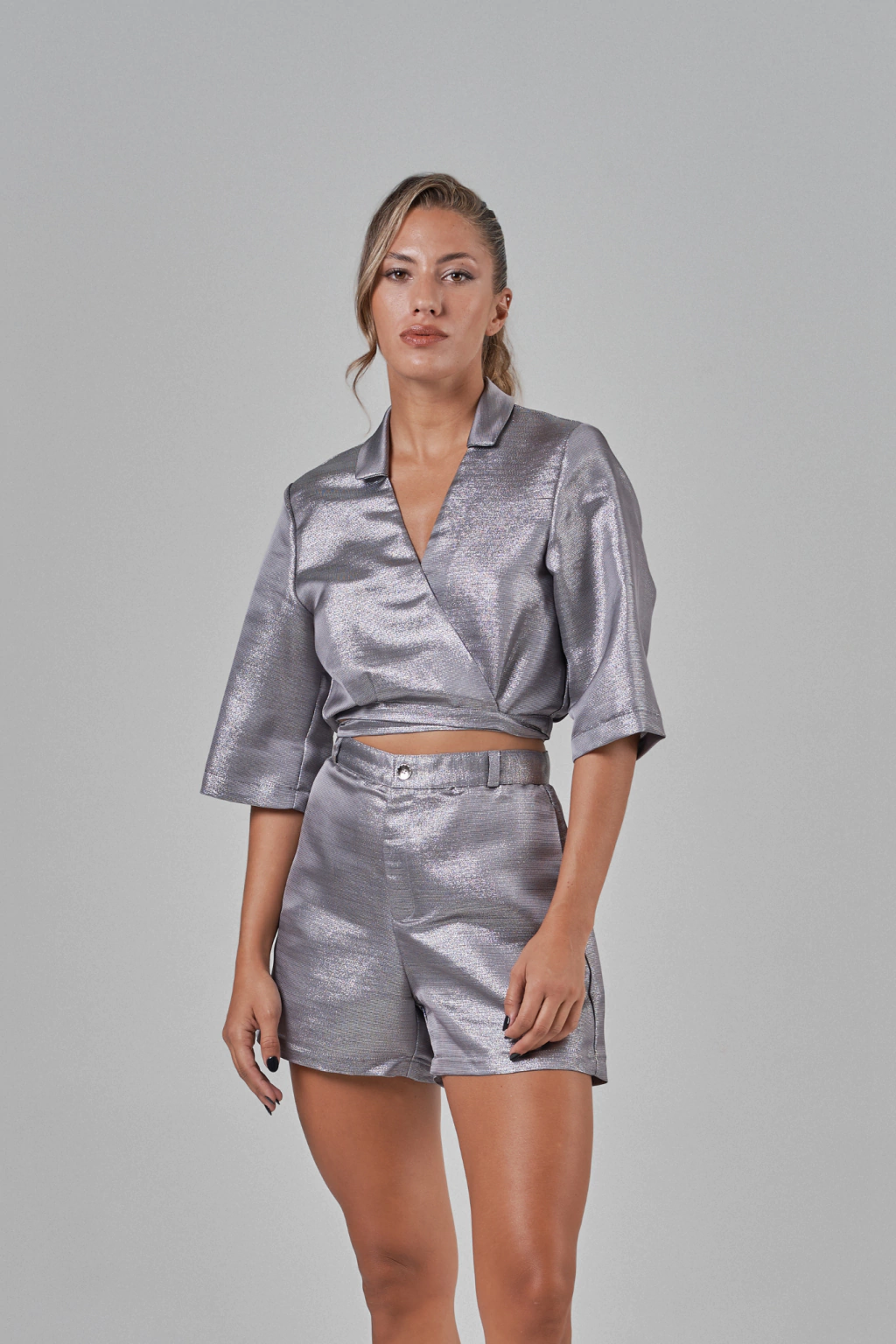 Top escote en V regulable (lleva cintas a la cintura para atar adelante o atras, segun la preferencia de cada uno). Es una tela diferenciada plateada con brillos. Viene en talles S, M y L. Se puede usar en conjunto con el GALAXY short.