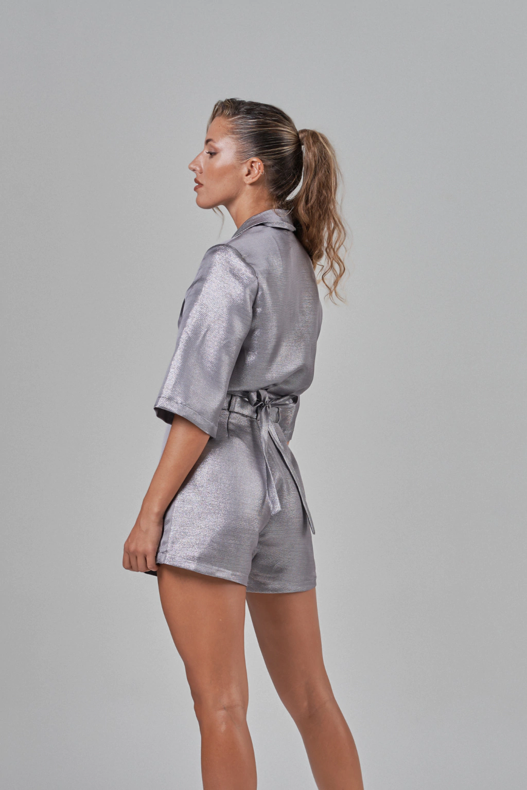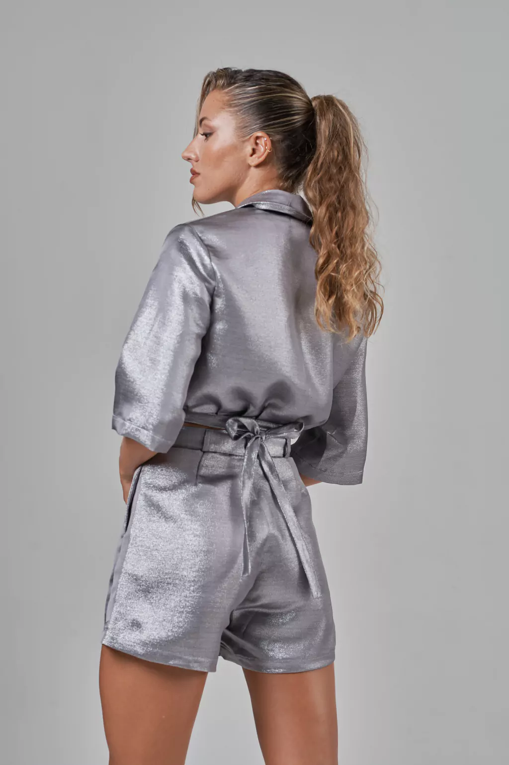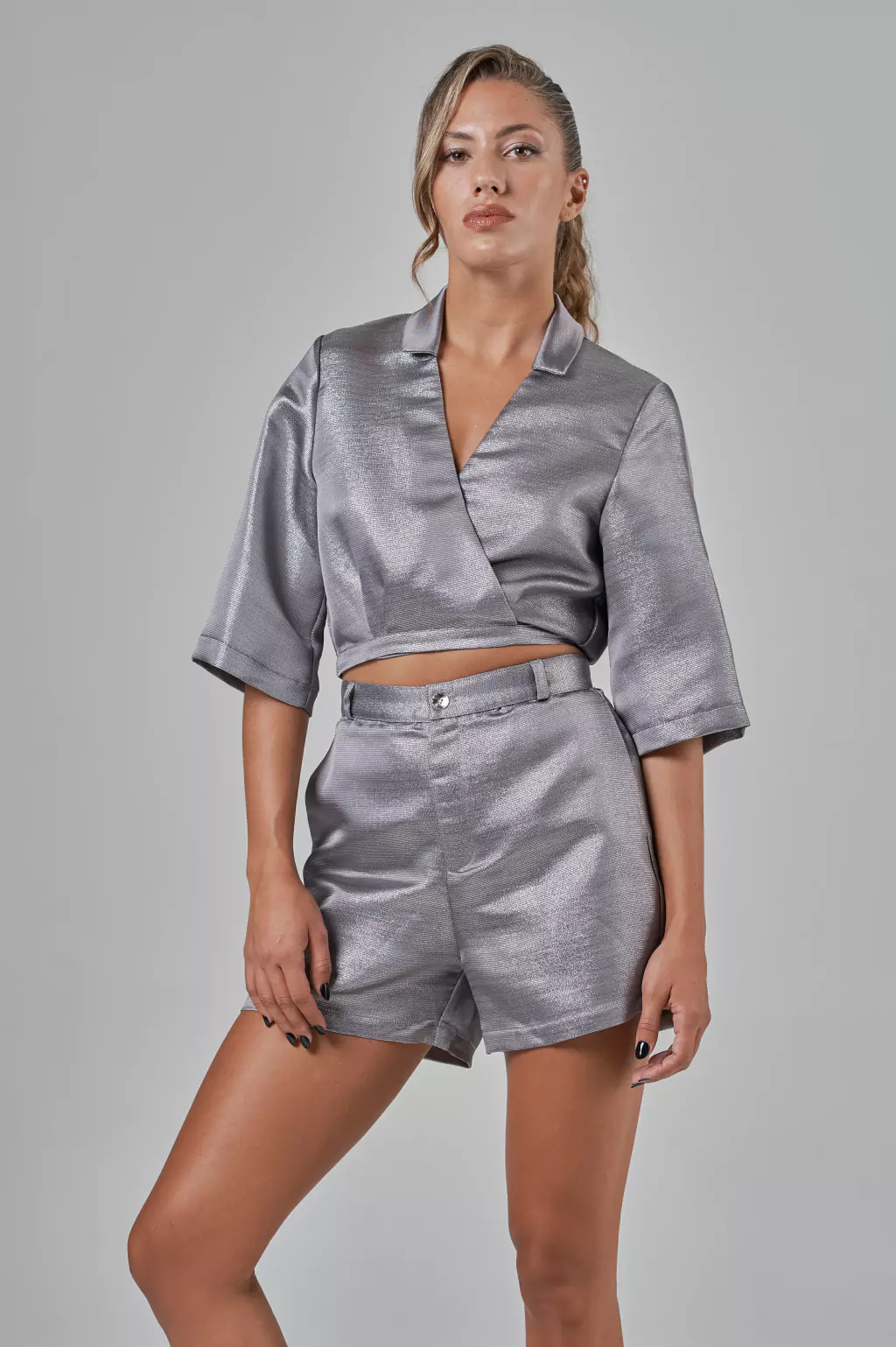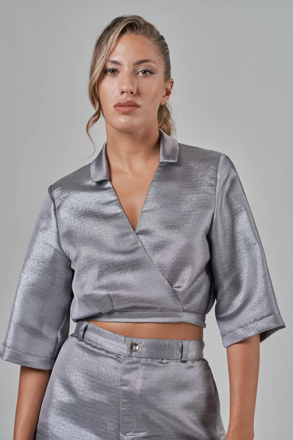 Top escote en V regulable (lleva cintas a la cintura para atar adelante o atras, segun la preferencia de cada uno). Es una tela diferenciada plateada con brillos. Viene en talles S, M y L. Se puede usar en conjunto con el GALAXY short.