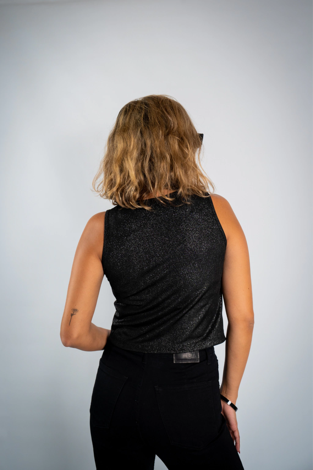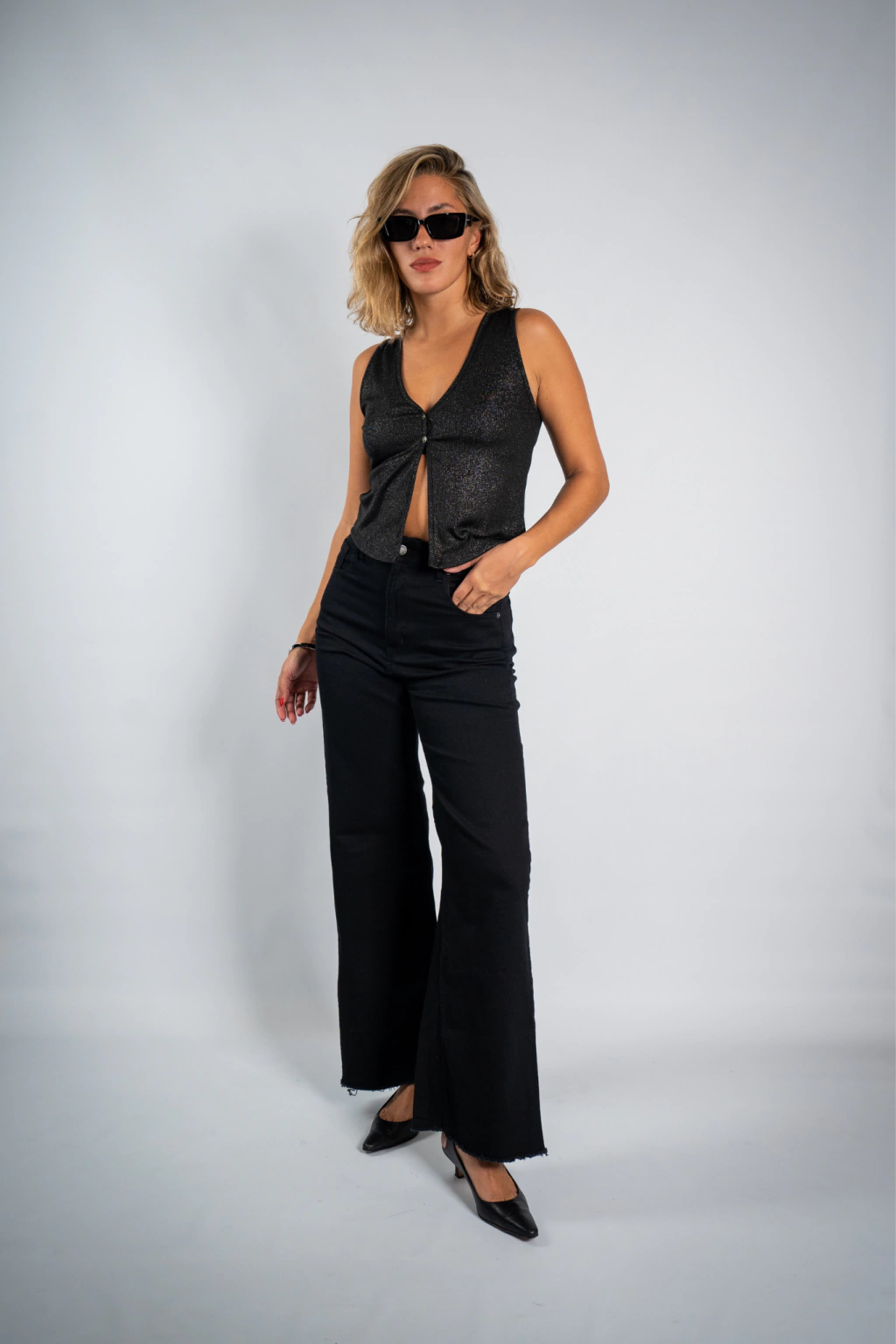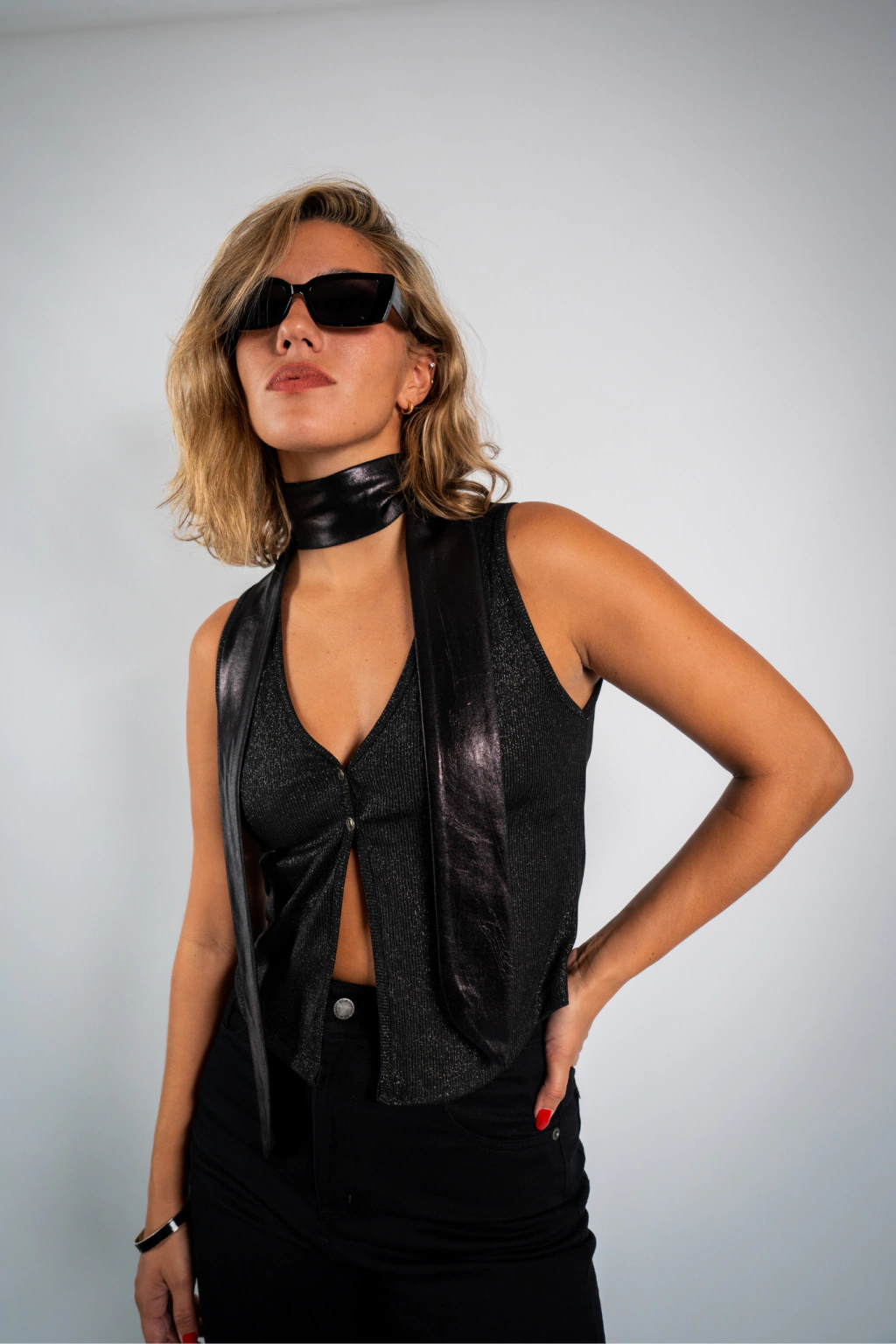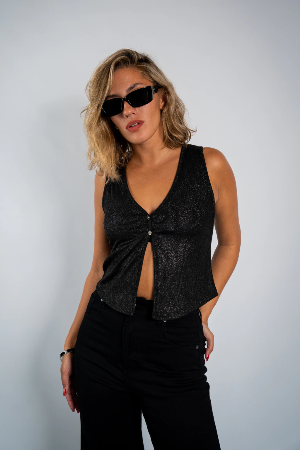 Top tipo chaleco sin mangas con abertura frontal y botones metalicos. Tejido ribb negro con lurex color peltre. Talle Unico.