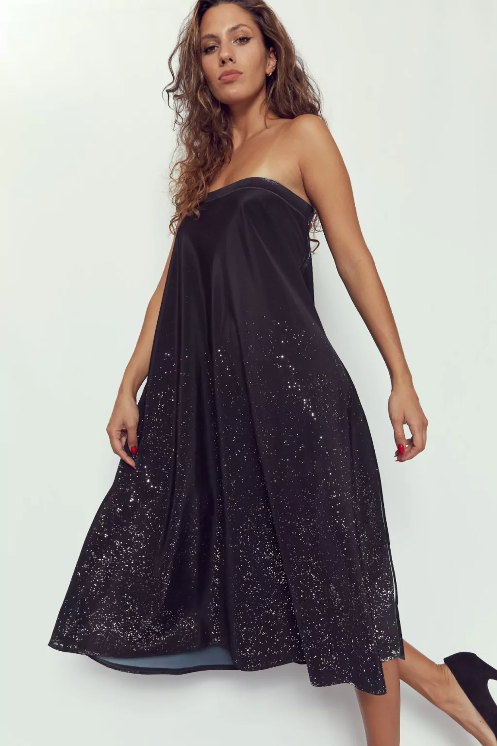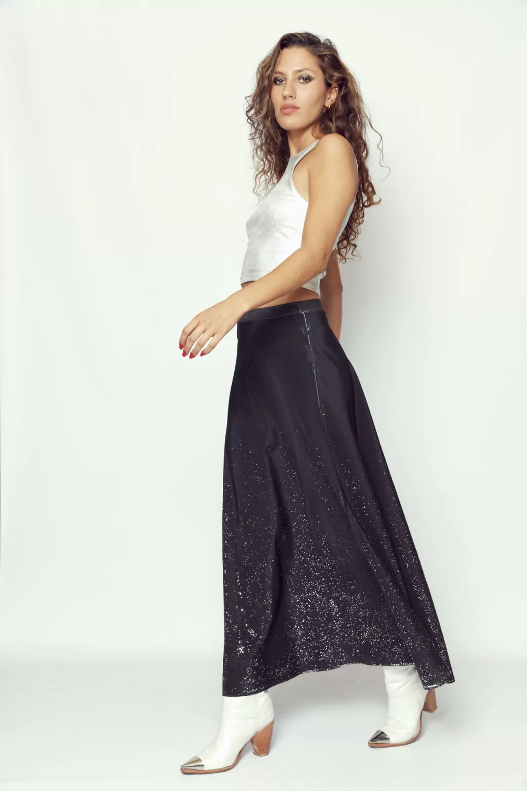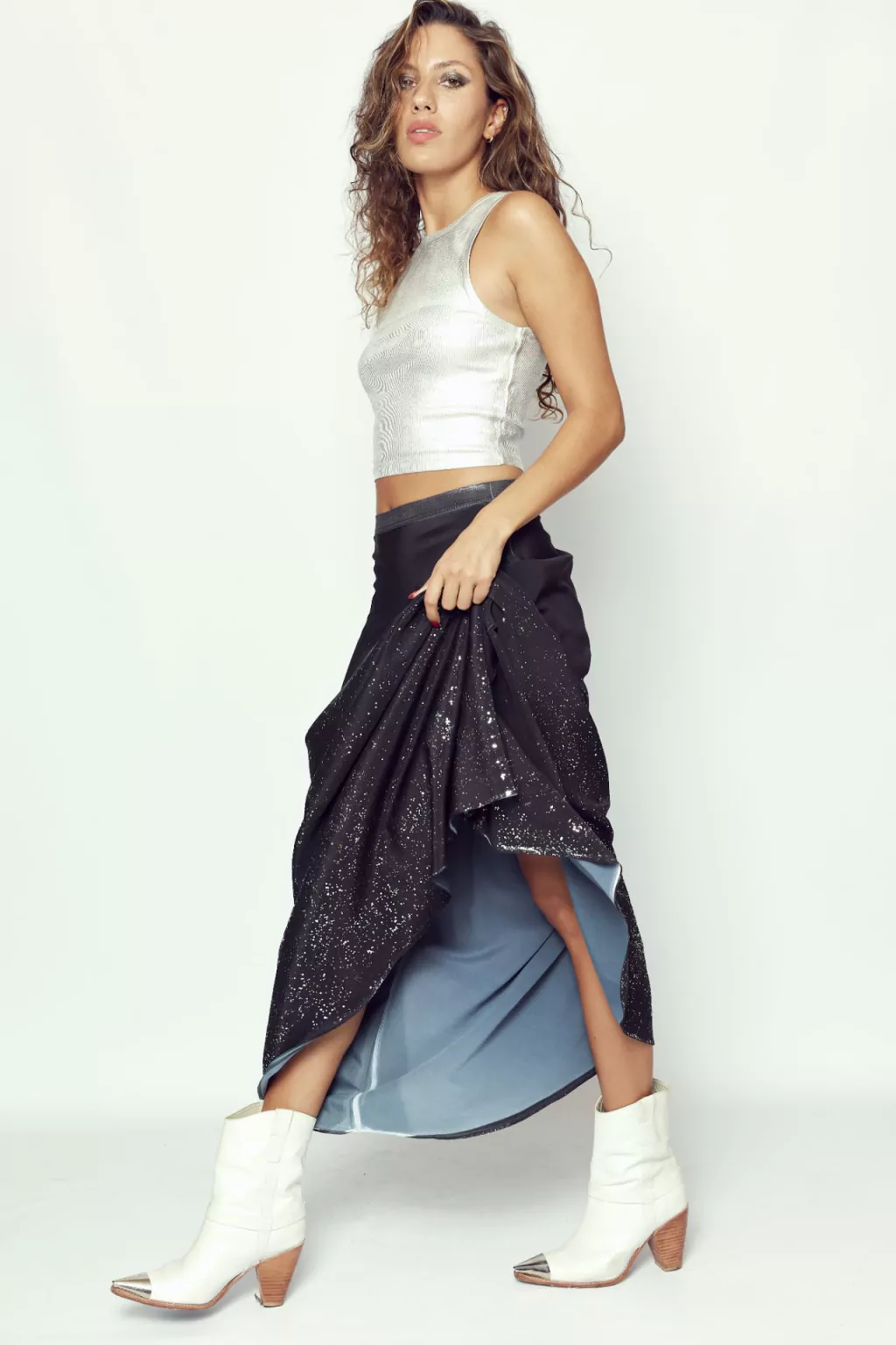 Es una pieza única que se puede utilizar tanto como un vestido strapless o como una pollera. La tela es fresca y no se pega al cuerpo. LLeva un proceso artesanal de coating con foil (color plata) en efecto molienda difuminado desde abajo hacia arriba.