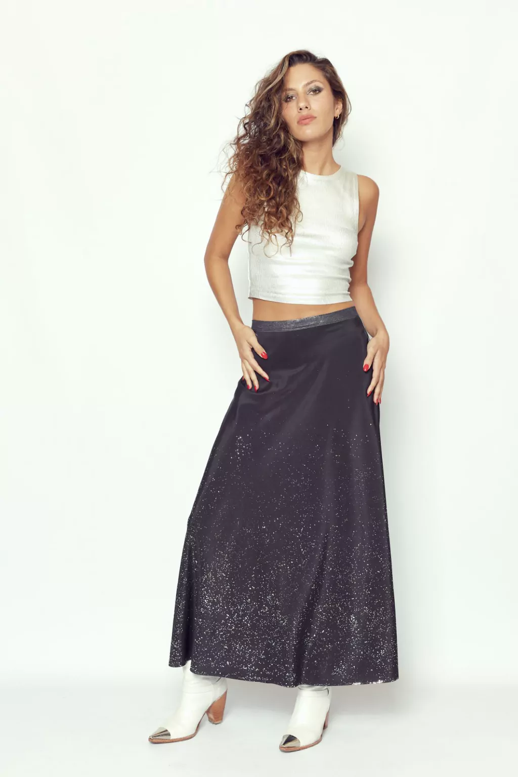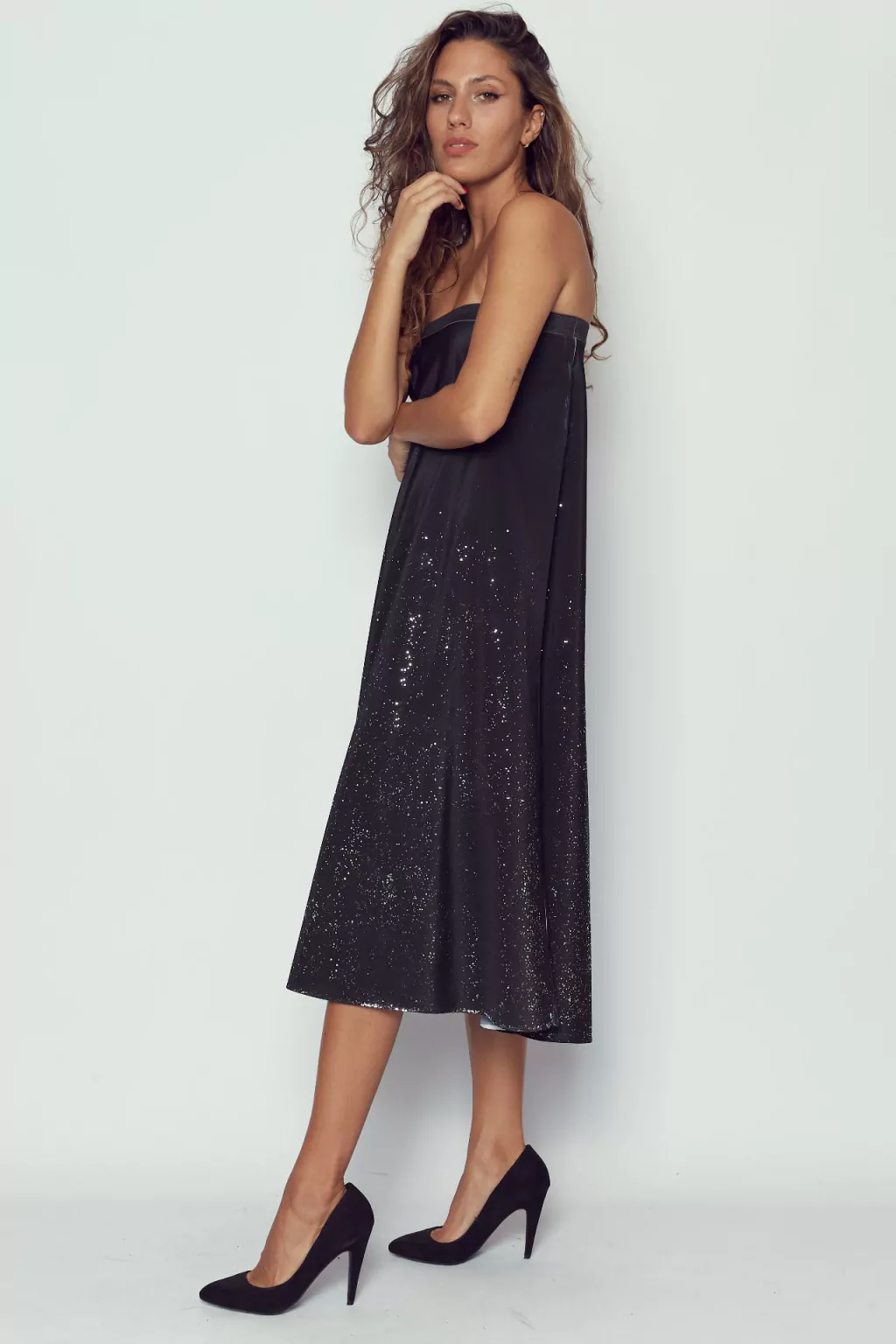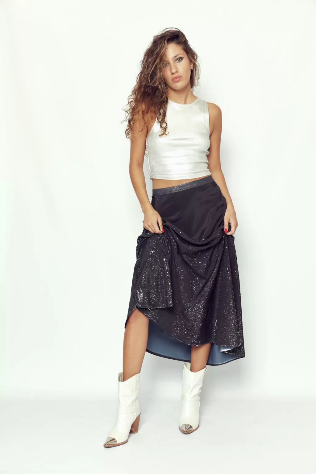 Es una pieza única que se puede utilizar tanto como un vestido strapless o como una pollera. La tela es fresca y no se pega al cuerpo. LLeva un proceso artesanal de coating con foil (color plata) en efecto molienda difuminado desde abajo hacia arriba.