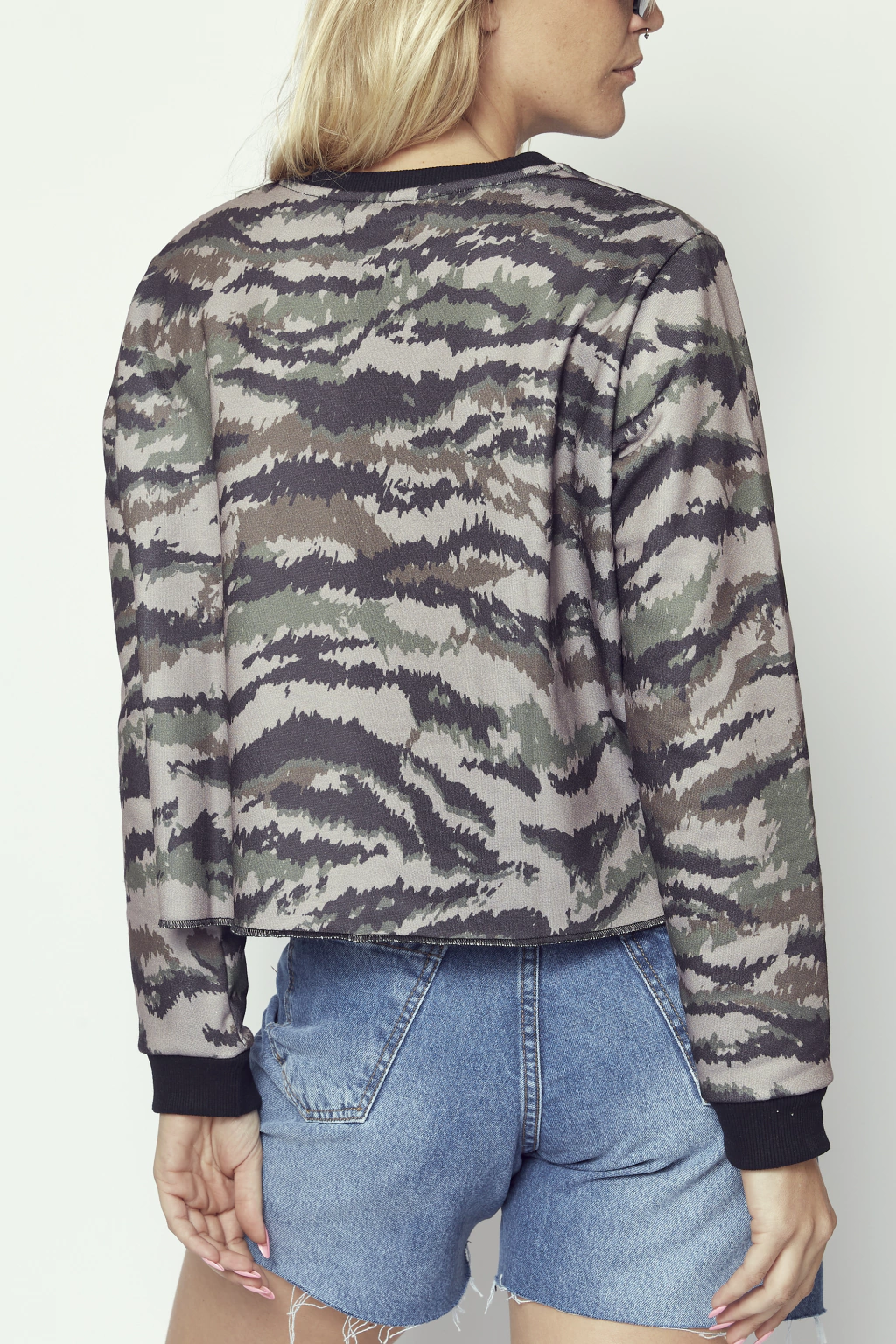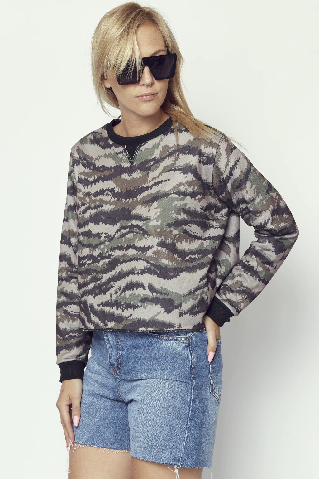Buzo corto con escote redondo. Tiene estampado camuflado con puños y cuellos en negro.